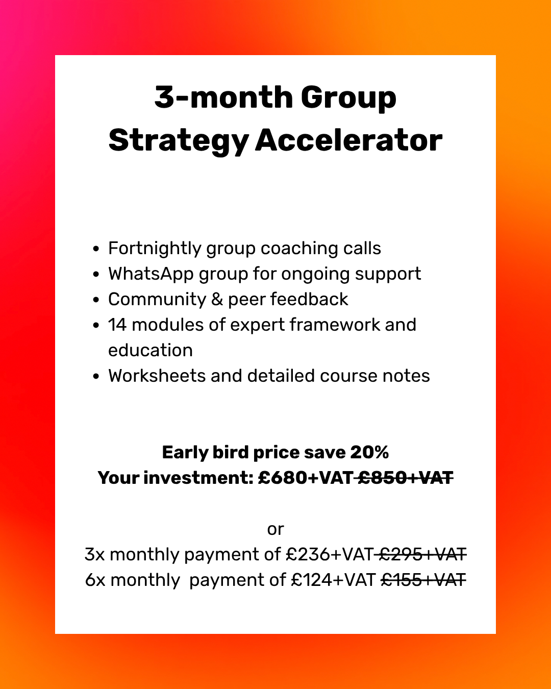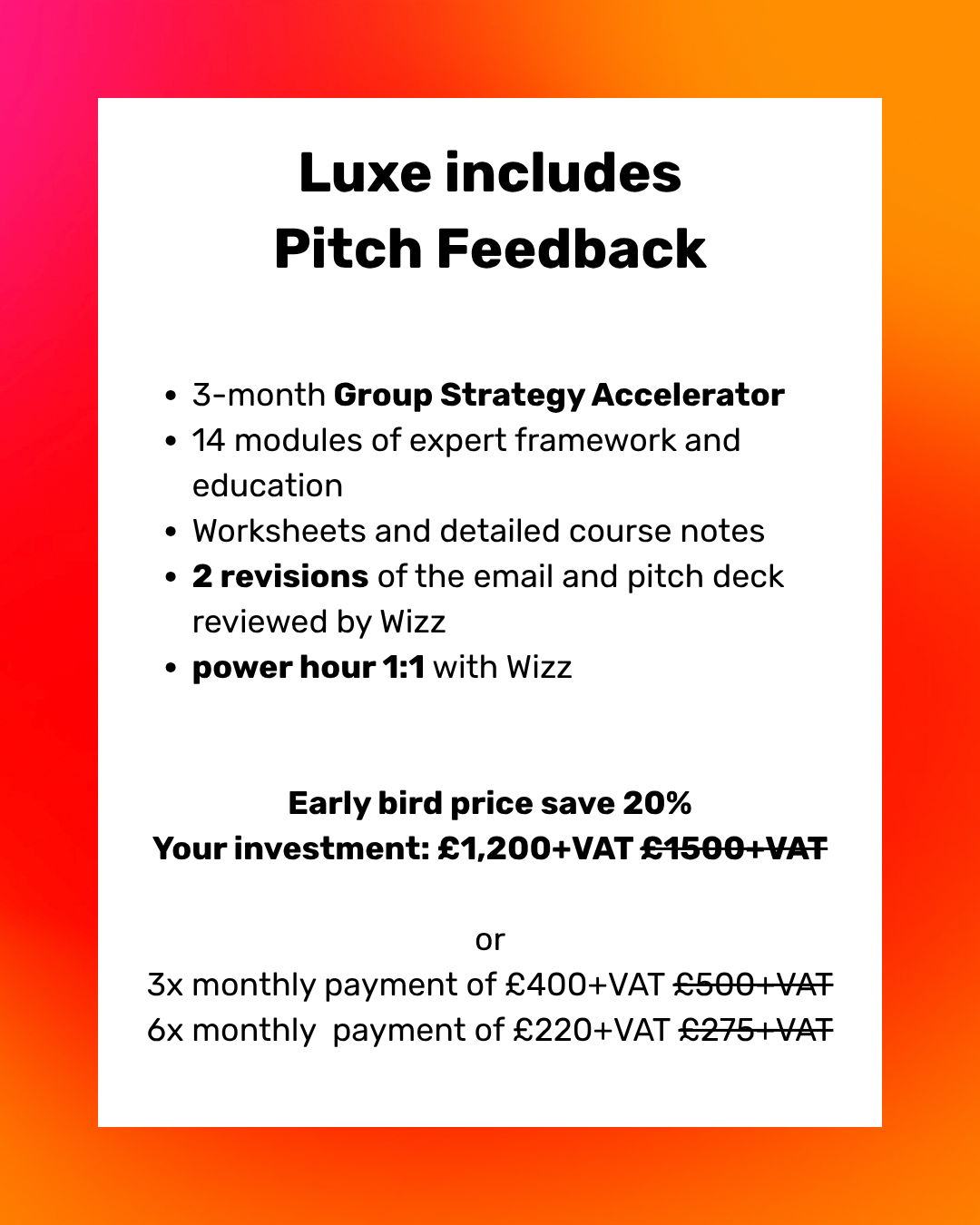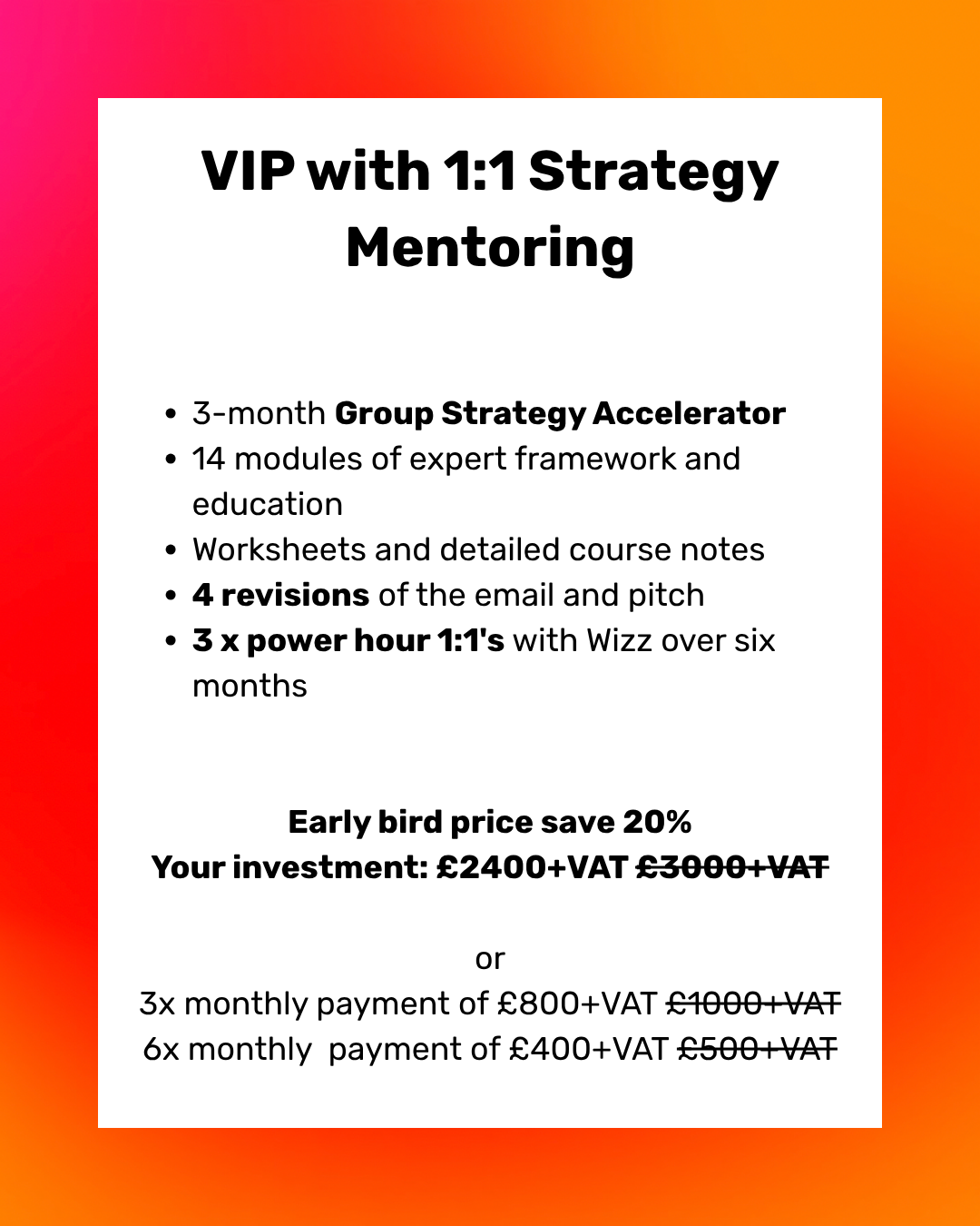 You can upgrade to 1:1 Strategy Mentoring, email info@wizzandco.com and we can book a call or simply use the link on this page